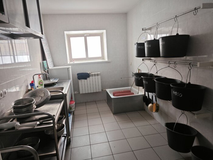 Кухня. Где мы замешиваем еду собакам. В кормлении используем специальный собачий фарш, который приходит к нам в виде сосисок по 6 кг. Фарш смешиваем с сухим кормом, заливаем водой и разливаем по мискам)