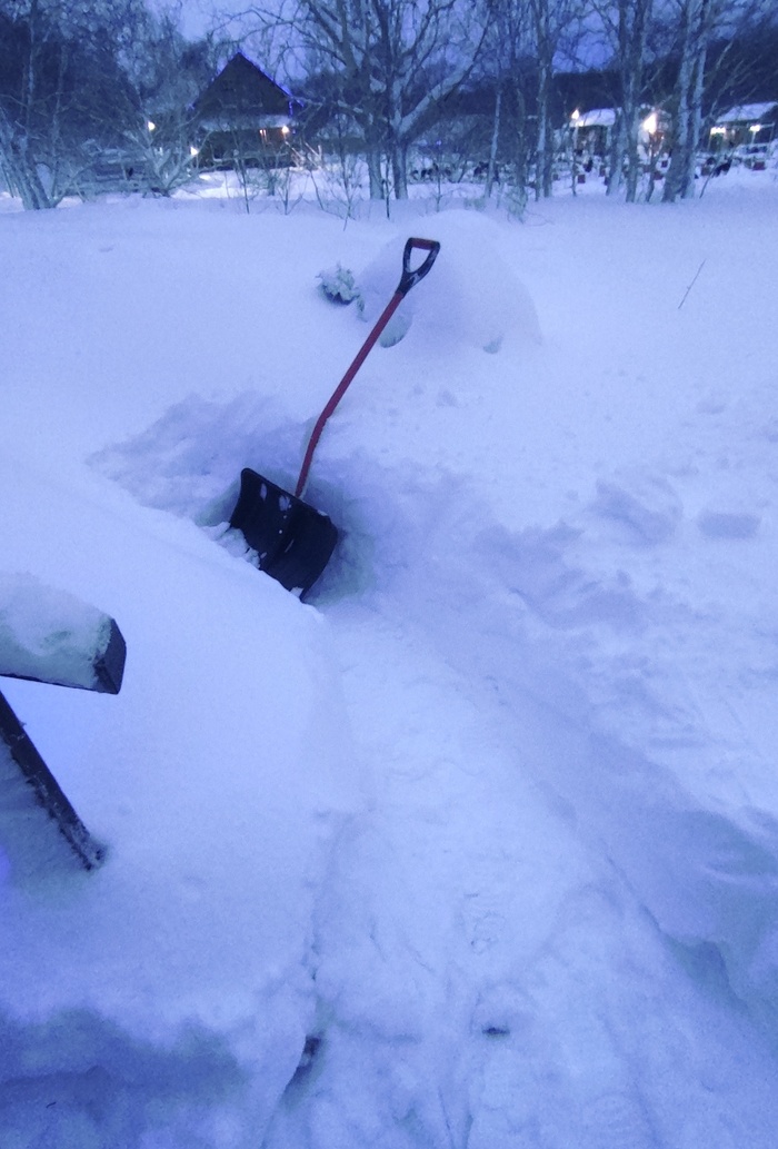 Вышла на улицу.. Ба! Чтобы выйти от домика, нужно прокопать тропинку, которую напрочь замело. Тропинка метров 9, сугроб высотой в метр.