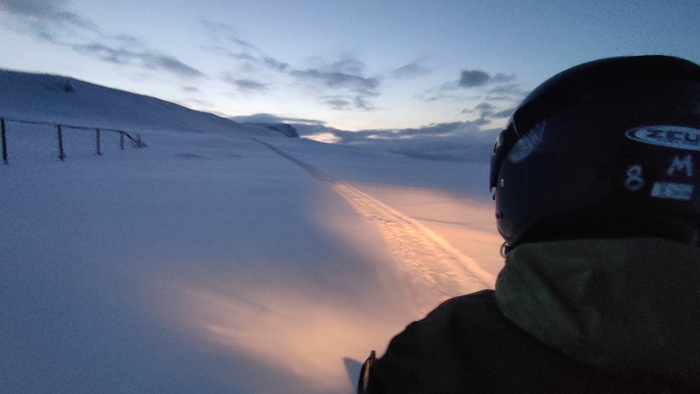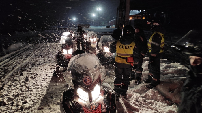 Дальше я запланировала тренировку собак. Поэтому позвала гида, который снегоходом после снегопада протропит мне трассу под собак. Едем накатывать.