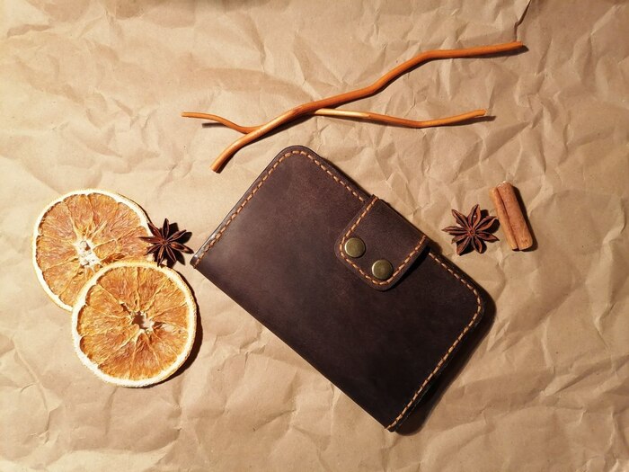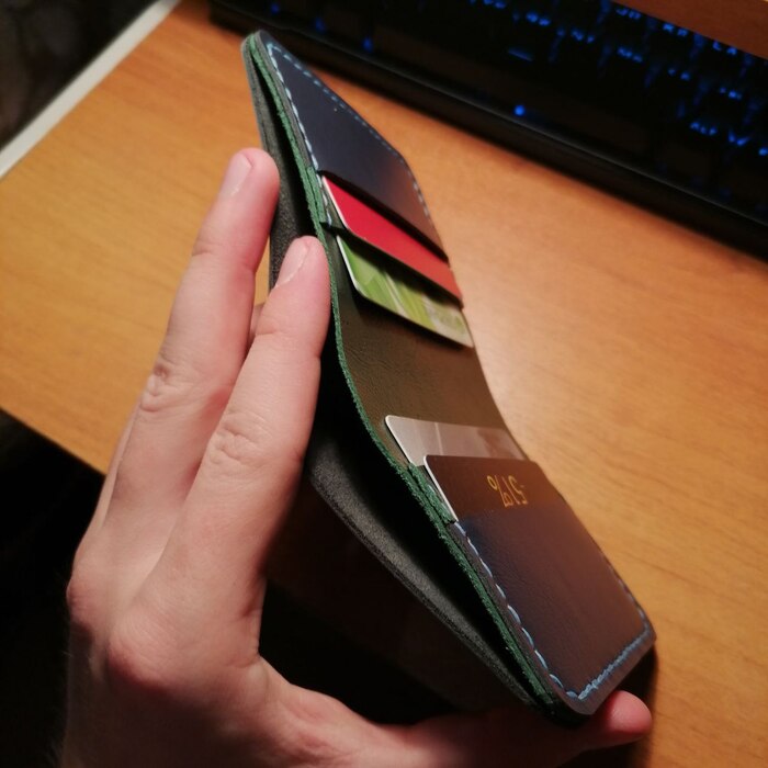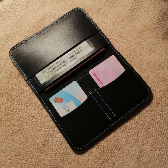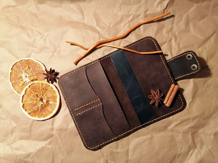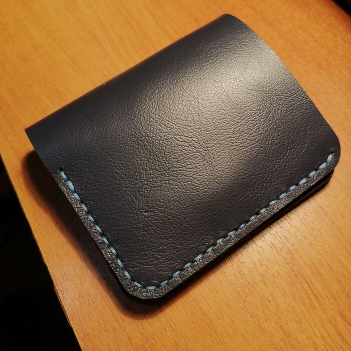 Пациент №1 портмоне для бати)), в котором я ошибся абсолютно везде, где мог, начиная от кривой выкройки и заканчивая длиной нити, которой мне не хватало (ВНИМАНИЕ) - 3 раза! В качестве материала использовал кожу 2мм так как хотел сделать прочную и качественную вещь, но увы на стадии сшивания перетянул нить и получилось откровенно так себе, но копилка опыта пополнилась, а отец в итоге был рад такому подарку.