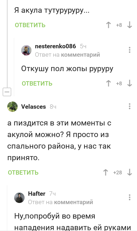 19 witchern11 Скриншоты комментов Снова в комментарии зашел, а там... 6 лет назад Пост про исследовательский укус акулы #comment_152726989 Показать полностью 3 Скриншот Комментарии на Пикабу Черный юмор Юмор Длиннопост