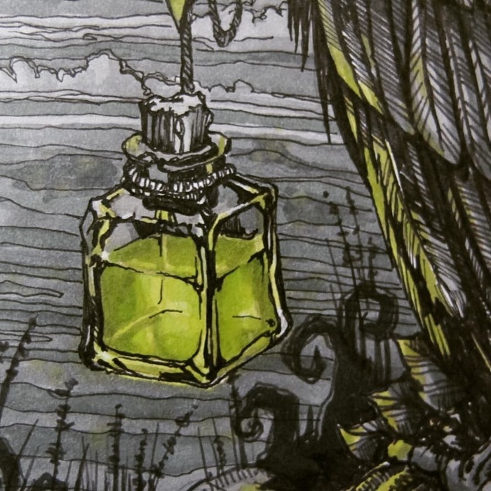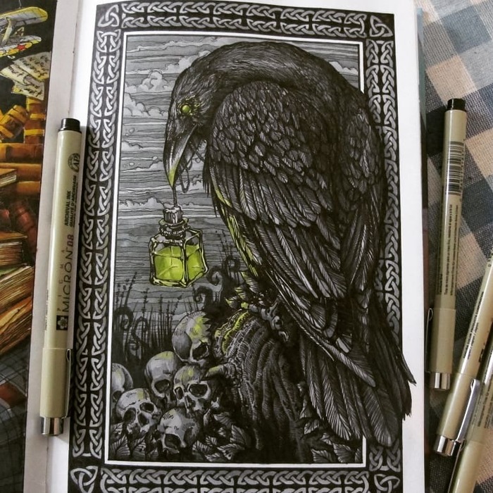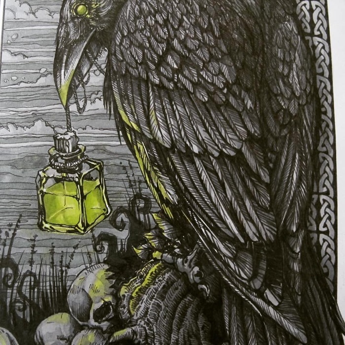 Мне подумалось, что нарисовать ворона с бутылкой некоего волшебного напитка и за одно (обожаю магию "за одно"!!!) попрактиковаться в применении ручек и фломастеров -- вполне себе неплохая идея.