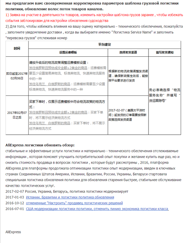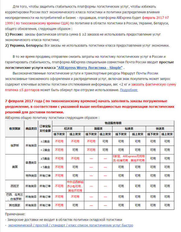 Всем привет дорогие на площадке AliExpress с 7 февраля 2017 года в 0.00 часов меняется политика доставки товаров с площадки AliExpress в страны Россия, Украина и Беларусь. Начиная с 7 февраля товары стоимостью 2 доллара и выше, не могут использовать Эконом Доставку в Россию. Для Украины и Белоруссии все заказы не могут использовать Эконом Доставку. Наши страны признаны AliExpressом как Небезопасными для эконом доставки. Правила ужесточаются в связи с резким увеличением потери посылок, связанных либо по вине службы доставки, либо по вине Недобросовестных покупателей, которые получив посылку без трек номера открывают спор о её якобы «скок доставки истекает а посылка в пути »и по спору забирают средства . В среднем посылки подорожают на 0.5 доллара при весе до 2 кг и стоимостью от 5 долларов но это еще не точно так как продавцы могут на свое усмотрение или повысить или понизить цену доставки ! Удачных покупок на али !