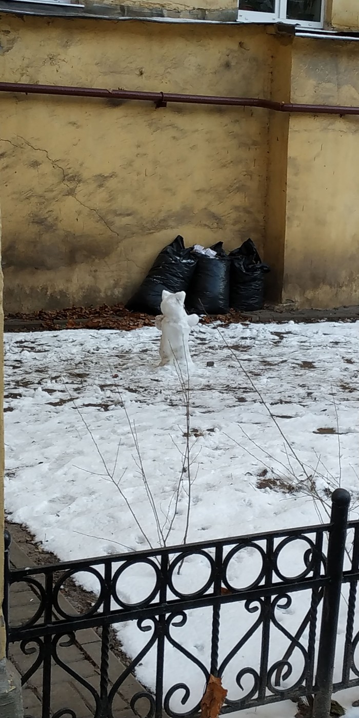 Ещё через несколько дней снеговик снова преобразился. Он повернулся лицом на юг, ему вернули руки и соорудили настоящие кошачьи уши (боюсь, что он стал анимешником). В таком виде он и стоит там до сих пор.