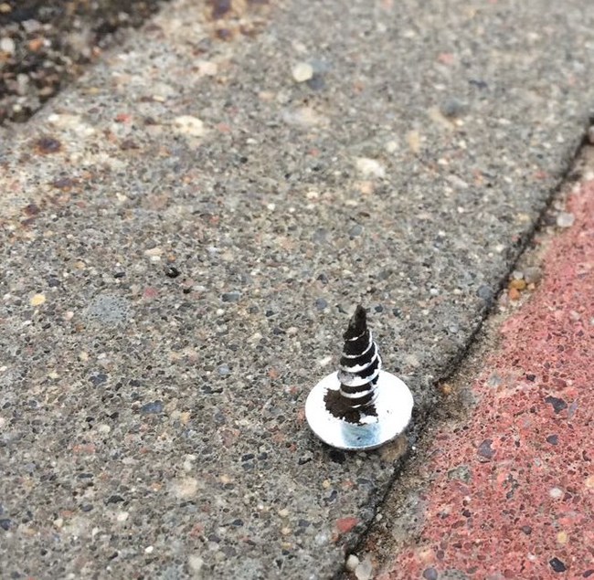 Еду на днях по другому проспекту, от переднего колеса со свистом мимо лица отлетает такой же саморез.