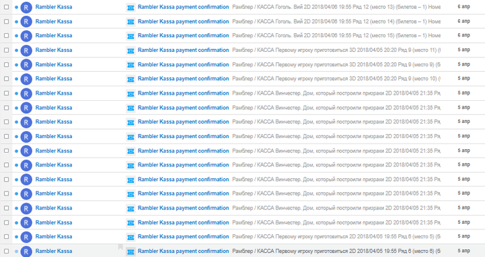 40 Писем от рамблер кассы с некоего адреса "booking@cinemapark.ru". Началась эта "акция" 5 апреля и закончилась 8. Внутри вроде как билеты на разные фильмы, в разные залы, на разное время и даже стоят "0.00₽". Мало того, все ссылки в письмах (вру, не знаю во всех ли, потому что проверять все 40 писем мне лень) ведут на оригинальный сайт кинотеатра и даже телефон указан верный...