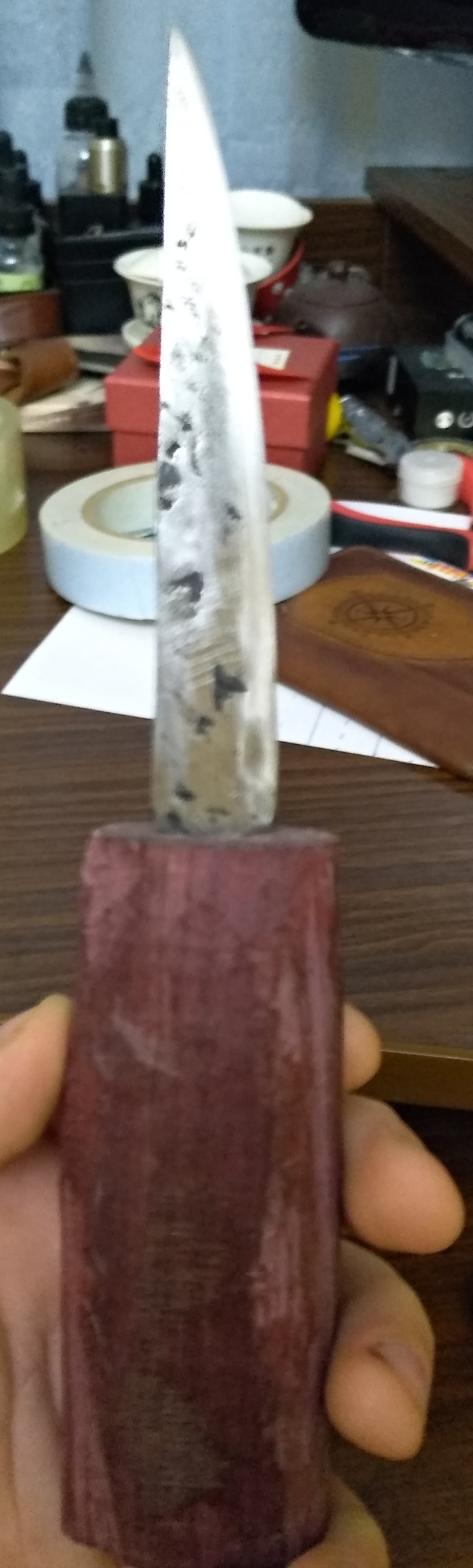 Хорошо хоть не в бою. Отправляю назад. Опять немного колдунства, утоньшение лезвия, увеличения яблока нормальная сварка и вот она, вот она железяка моей мечты. Баланс 13см вес 1500.