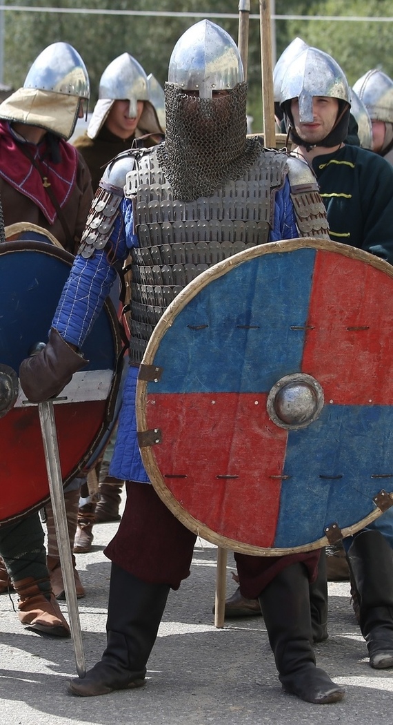 Описывать все действо и ту гамму эмоций что я пережил не буду. Там нужно быть и прочувствовать на себе. Вернёмся к сбору собственного шмотья. Этот выезд дал мне очень ценный урок. Кольчуга нихрена не держит удар. Да она даёт +3 к пафосу и +10 к аутентичности, но силу удара не гасит совсем. Поймав пузом удар копья, как говорится от души, я понял что вопрос с защитой надо обдумать как следует. Ибо в бухурт хочется, а на больничный не очень. Поковыряв барахолку реконструкторов нашел отличную стеганую куртку, 8 слоев ватина и кожаные подкладки в рукавах. Сшил под нее верхнюю рубаху и благополучно опробовал на первой же тренировке. Удары чувствуются как сквозь подушку и вроде как все радужно и прекрасно. На первом же выезде у стегла образовались 2 существенных минуса. В нем жарко как в сауне и со стороны я похож на огромный шар с железной шапкой.