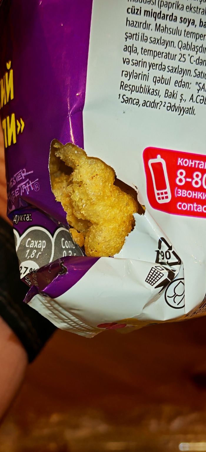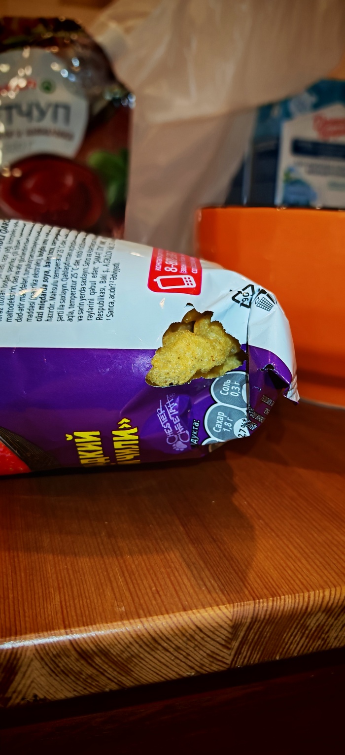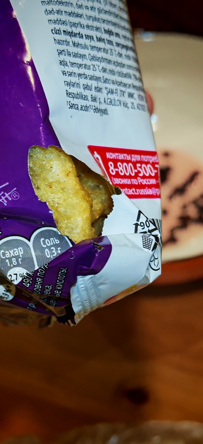 В этот раз заказал чипсы, хорошо, что решил с них и начать. Чипсина на вкус показалась мне выветренной. Осмотрел пачку и ужаснулся: внизу пачки была прогрызена дыра, через дырку видно, что несколько чипсин тоже были погрызены.