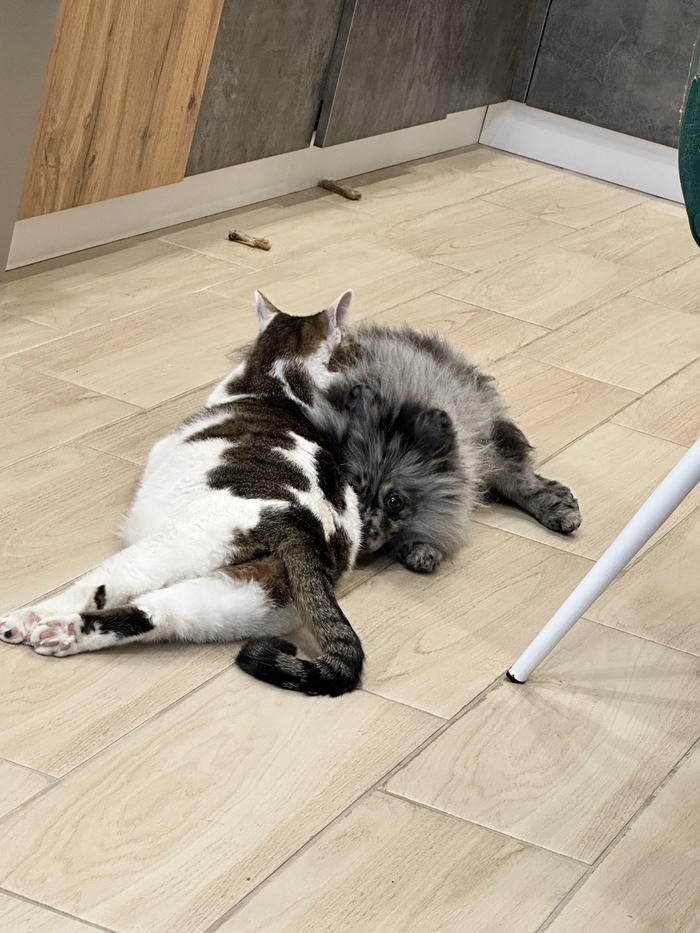 Адаптация? Да не было у него адаптации, он зашел домой и сразу понял что теперь он тут живет 😅 никакого скулежа по мамке, переживаний, страхов. Моментально освоил все свои игрушки, нашел лежанку, плед, вкусняшки - в общем парень у нас очень адаптивный и контактный) их отношения с котом вообще не доставляли хлопот (тут коту прям респект. Он у нас домашний, собак видел пару раз в жизни - но щенка принял сразу)
