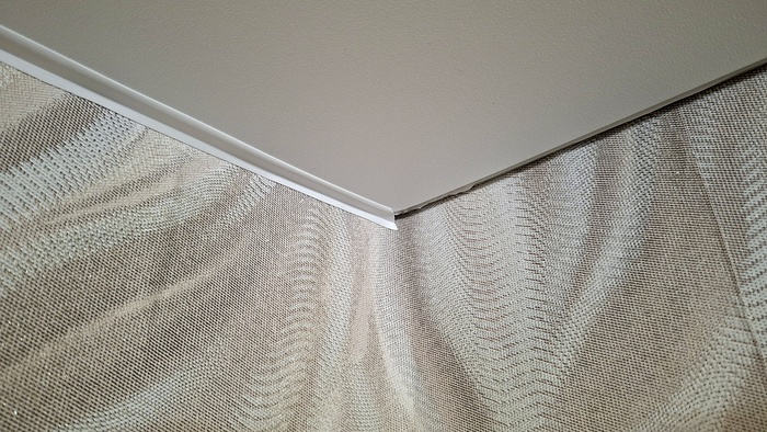 После монтажа багета приходит время полотна. Так как полотно без нагрева, его нужно максимально натянуть на потолке. Сначала закрепляется по центру с каждой стороны.