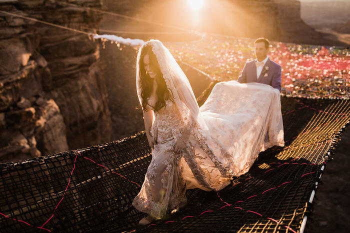 Идея организовать церемонию над пустыней пришла молодым из-за собственного пристрастия. Они настолько неравнодушны к высоте, что буквально решили заключить брак в воздушной атмосфере. Торжество прошло в когда-то в недалеком прошлом руднике Юта. Именно здесь молодая пара в первые увиделась. Райн и Кимберли стали настоящим подтверждением поговорки о том, что все браки совершаются на небесных просторах. Как раз здесь будущий жених и сделал предложение девушке. Это произошло над великолепной долиной, располагающейся на вышине в 121,92 метр. Убеждение в том, что это не такая уж и приличная высота может возникнуть лишь потому, что вас там не было. Оригинальная фотосессия свадьбы в таком месте убедит вас подумать иначе.