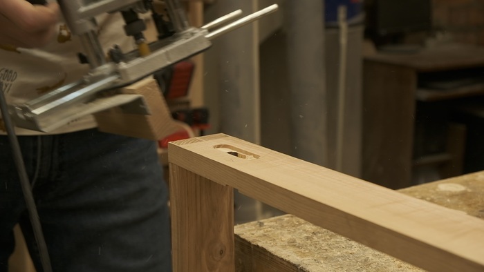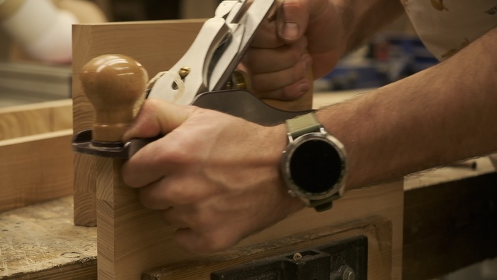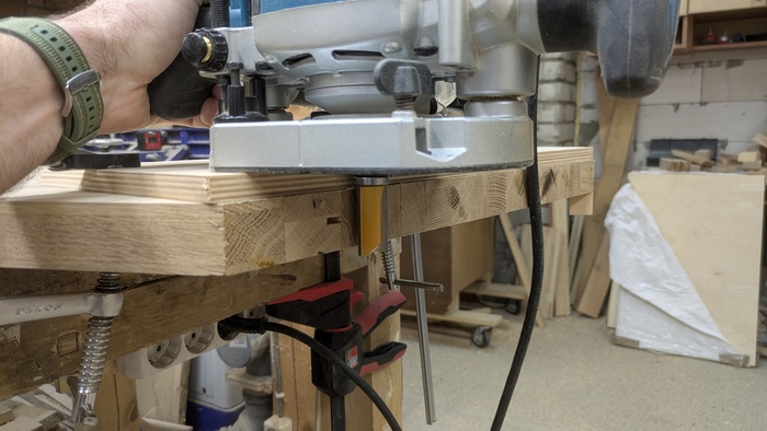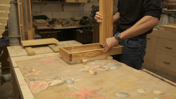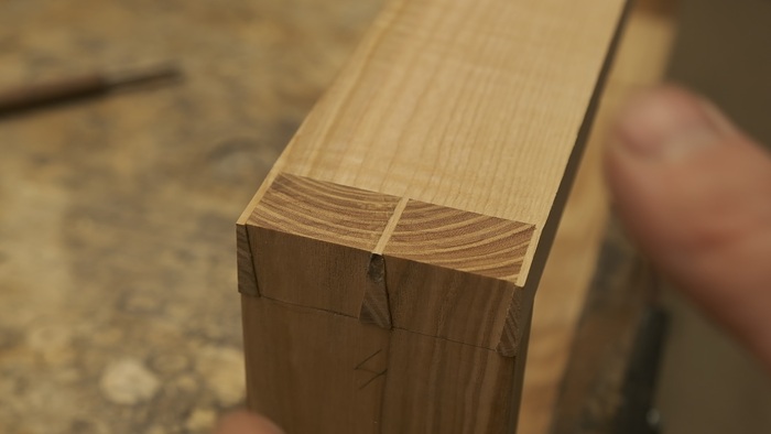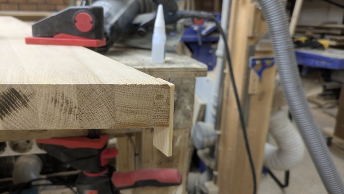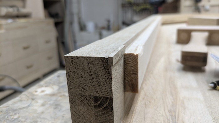 Корпус склеен на ус. 45 градусов под склейку фрезеровал при помощи самодельного упора (о причинах именно такого способа рассказывал ранее)