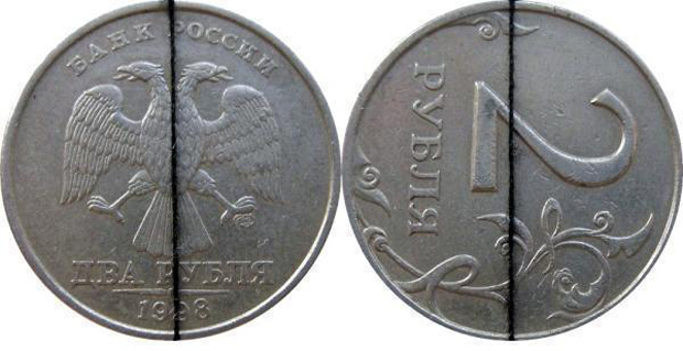 «Чеканка на несоответствующих заготовках». Монета может быть отчеканена на заготовке, предназначенной для другого номинала. К примеру, известны 3 и 20 копеек СССР, отчеканенных в металле друг друга. Известны 2 копейки, отчеканенные на 10-копеечных кружках. Самое главное при исследовании такой монеты – это ее масса: чтобы определить, действительно ли она сделана из заготовки для другой монеты, и для какой конкретно. Известны чеканки 2-копеечных монет 1924 года на кружках для копеечных, а также 5-копеечных на кружках для 3-копеечных. При этом металл заготовки не полностью заполняет пространство между штемпелями, монета получается не только меньшей толщины и массы, но и меньшего диаметра. Поскольку заготовка частично или полностью не достает до ограничивающего гуртильного кольца, монета получается не идеально круглой, без гуртовых насечек на большей части боковой поверхности или вообще по всей окружности.