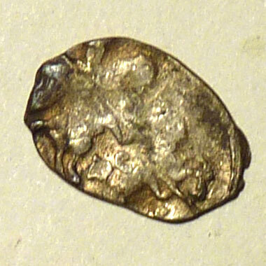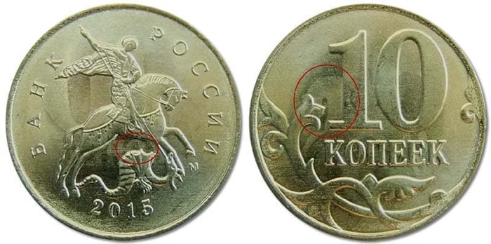 Иногда откалывается небольшой кусочек штемпеля, например, выпуклый столбик, чеканящий просвет какой-нибудь замкнутой или полузамкнутой фигуры изображения, буквы или цифры. Получается как бы «нашлепка» на монете. Такой брак называется «выкрошкой штемпеля».