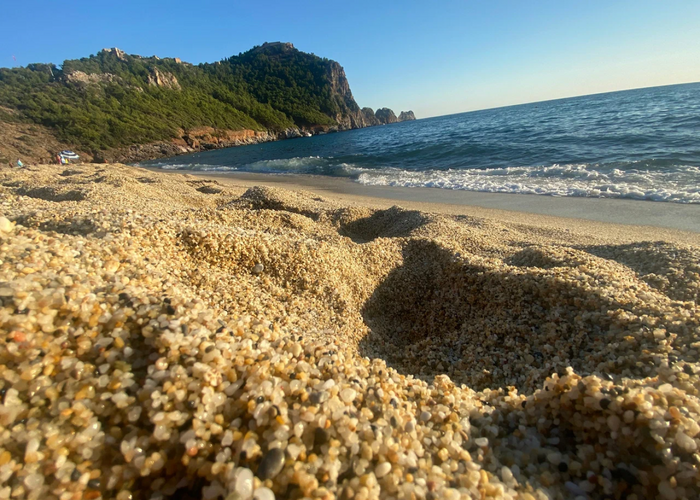 Песок здесь мелкий и золотистый, а вода — кристально чистая. Пляж отлично подходит для плавания благодаря пологому входу в море. Оттуда можно подняться к крепости Аланьи, чтобы насладиться видами, а также прогуляться по набережной, полной кафе и сувенирных лавок.