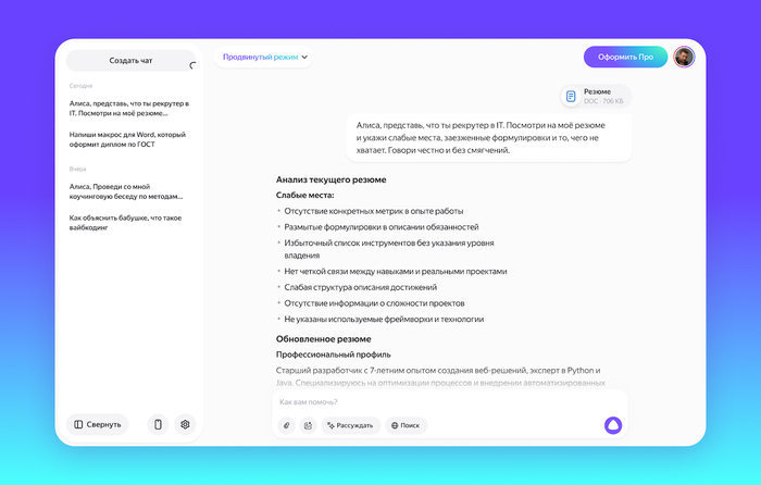 В этом режиме нейросеть Алиса пошагово решает задачу: прежде чем ответить на вопрос, она выстраивает логическую цепочку рассуждений. Следить за ходом её мысли можно в реальном времени. Вы сможете понять, как нейросеть рассуждает и почему делает именно такие выводы. А заодно — взять на заметку её подход.