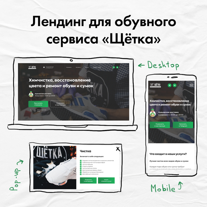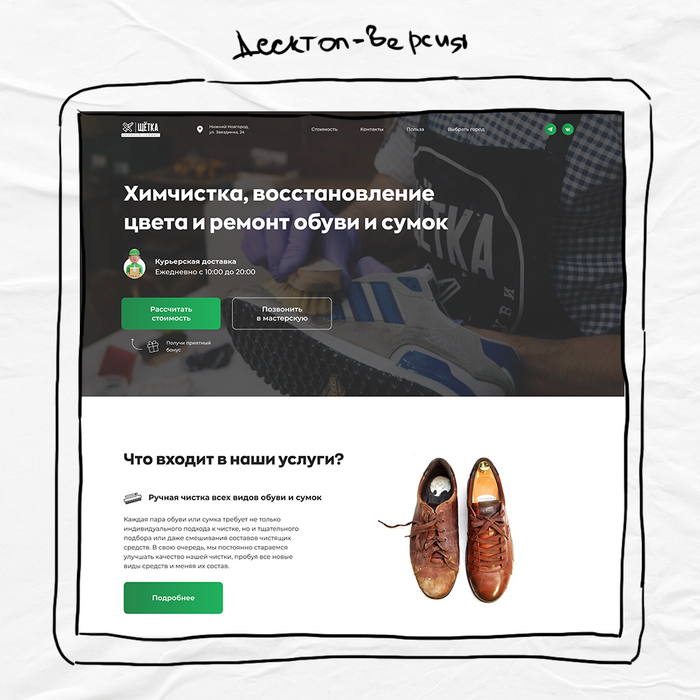 Щётка — это локальный обувной сервис в Нижнем Новгороде, который сначала задумывался как узкоспециализированный сервис по чистке обуви, а в итоге стал местом, где можно получить комплексную услугу: почистить, покрасить и отремонтировать обувь.