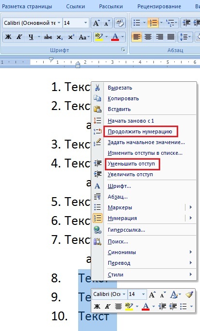 Такой способ не сработает если вы уже попробовали редактировать абзац вручную выделяя кусок списка. В таком случае придется список редактировать обратно, выделять кусок, нажимать правой кнопкой и выбирать, либо "Продолжить нумерацию", либо "Уменьшить отступ".