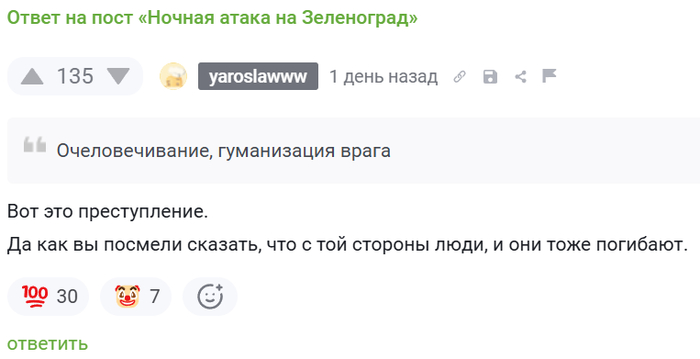 - Очеловечивание, гуманизация врага, опять мы напали на мирную, ничего плохого не сделавшую Украину, и вообще не имеем права ненавидеть вражеское государство и его население, надо каяться, извиняться и молчать, а ненависть это плохо.