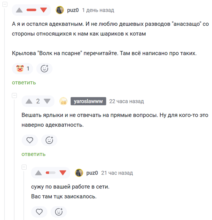 То есть он первым же сообщением повесил на меня ярлык, просто за то что мне не нравится дегуманизация людей в любых проявлениях.