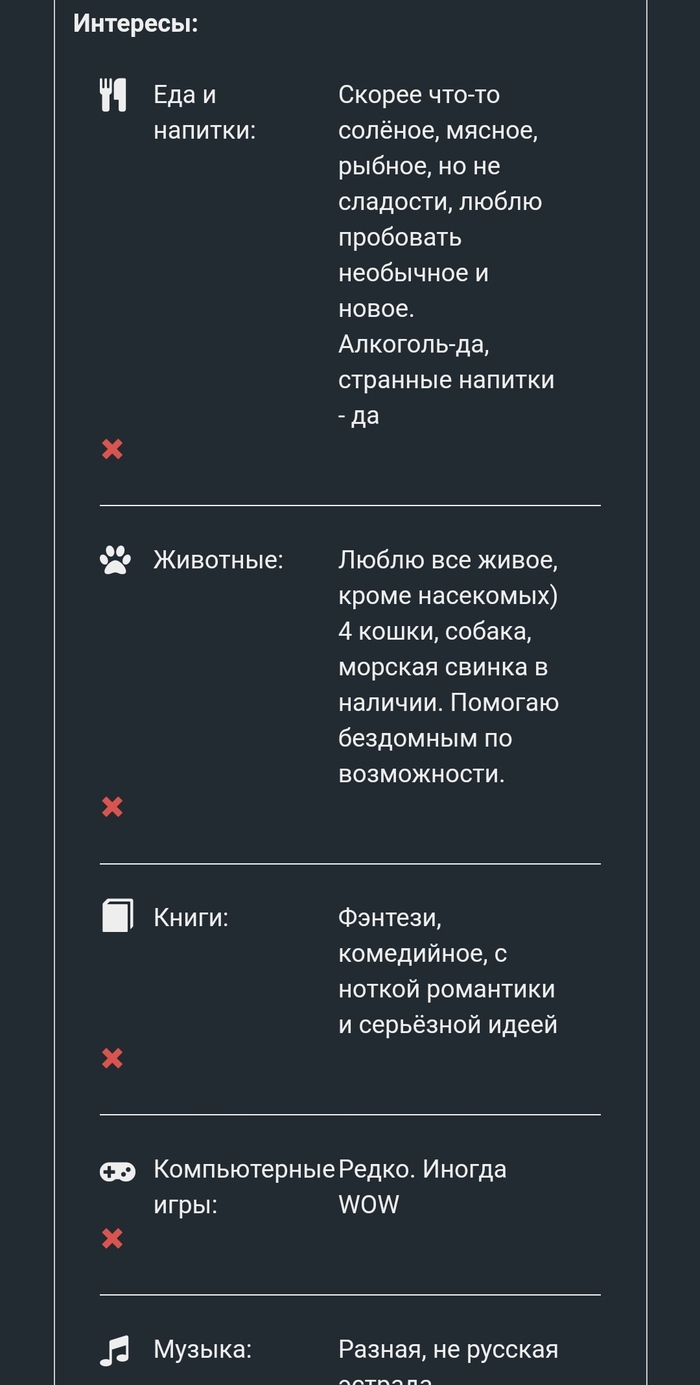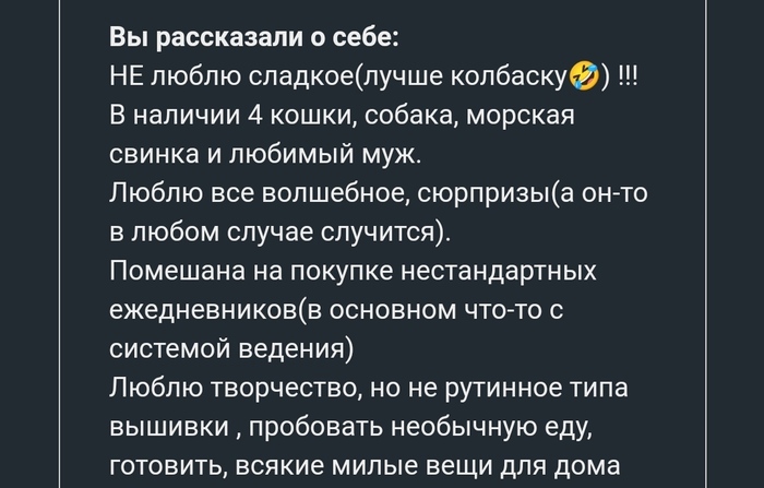В интересах я указала, что не люблю сладкое, люблю всякое солёное, необычное, лапшу бп и вообще странную еду.