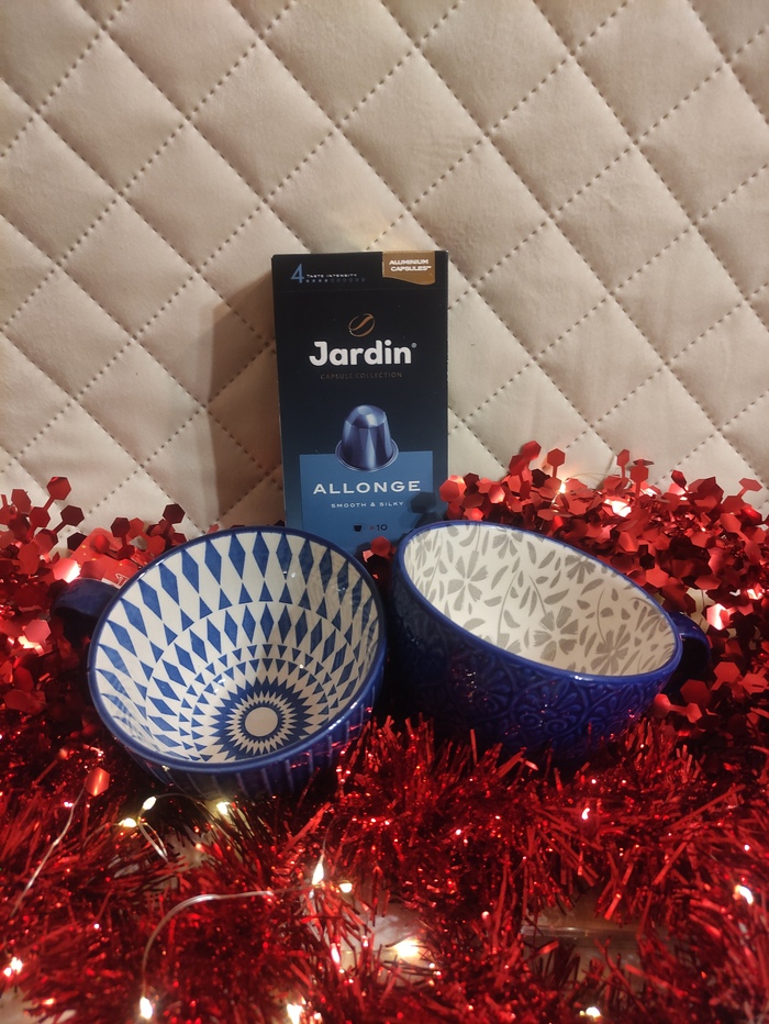 Еще в анкете пожаловалась, что никак не могу подобрать хорошую чашку к моей кофемашине. Снегурочка написала, что ей знакома данная проблема и выслала аж 2(!!!) красивущие. Это любовь с первого взгляда, цвет и дизайн загляденье! А к кружкам ещё и кофе приложила, ммм!