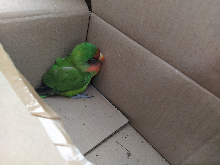 Сидел неподвижно на засохшем борщевике. Видимо, пытался отогреться на солнце. Чтож. Визуально было понятно, что это попугай, и что долго он так живым не протянет. Сходили за коробкой в ближайший магазин. Вернулись и тихонько его в эту коробку засунули.
