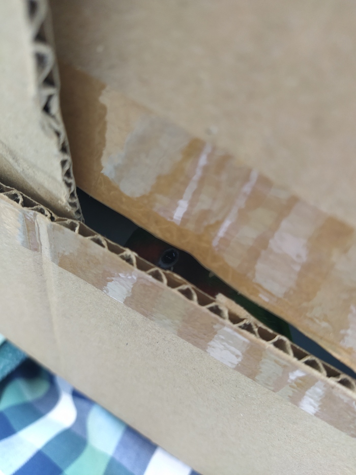 Особого сопротивления птиц не оказывал. Решено было нести его домой, а там уже думать куда его. По пути зашли в зоомагазин, купили корма и взяли коробку по-больше (хз насколько он у нас). Продавец в магазине рассказала, что одна из постоянных покупательниц ищет своему попугаю пару, а так как наш попугай относится к породе(?) неразлучников, как и попугай постоянной покупательницы, то это было бы чудесное воссоединение. Идея показалась мне здравой и мы обменялись номерами.