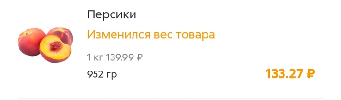 Несколько раз пользовалась доставкой. И каждый раз то чего-то нет, то подходит срок годности, но употреблять в пищу, в целом, можно было. В этот раз заказала персики, 952 гр. - 8 персиков, два из которых сразу в помойку