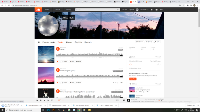 Ну и, наконец, вот вам образец того, что получается, когда я пишу на русском. И, кстати, на SoundCloud я сейчас загружу свежайший кавер, чтобы убить свою самооценку в хлам показать вам, что мои вокальные способности действительно хреновые, и я не кокетничаю, пытаясь получить комплимент.