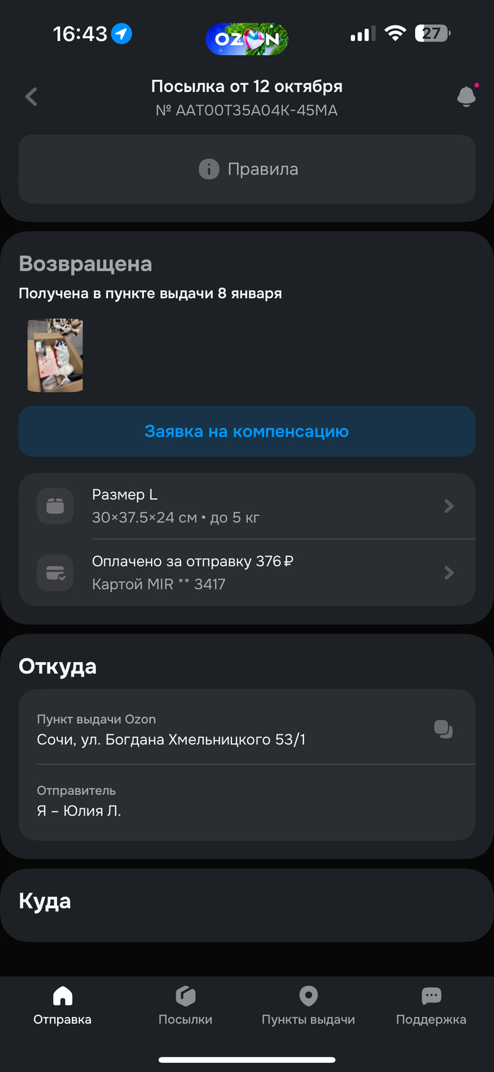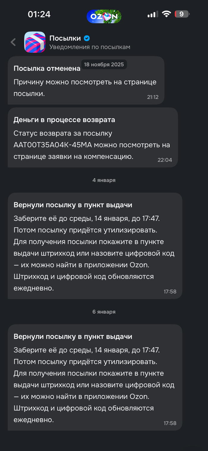 Всем доброго времени суток. Честно сказать, не думала, что буду снова писать здесь пост по поводу своей посылки AAT00T35A04K-45MA отправленной 12 октября с Адлера в Тулу. Ведь казалось бы история закончилась, потому что она потерялась, и поиски не дали результатов, здесь озон официальный дал ответ, что она утеряна, найти не удалось, в итоге 18 ноября 2025 г. вернули 3 тысячи, которые я указала по глупости, ведь ценность была куда выше. Естественно, как бы не хотелось с этим смириться, но пришлось забыть об этих вещах, что-то за это время я уже купила, но все содержимое посылки найти все равно не удалось, конечно же. Про озон я и думать забыла после этого случая. Но 28 декабря 2025 года я зашла в приложение и увидела, что моей посылке присвоили дату доставки, это было 1 января, сначала я удивилась, но потом подумала, что это просто какой-то сбой системы, потому что Новый год, и возможно оно проставилось автоматически, и благополучно об этом и думать забыла. Но зайдя в приложение снова 3 января, я увидела, что дата поменялась на 6 января, махнув рукой, что это все еще сбой, и как в прошлый раз дата пропадет потом, не заходила в приложение… до вчерашнего дня. Когда я зашла, то увидела, что посылка пришла в пункт выдачи еще 4 января, с которого я её отправляла, то есть вернулась в Адлер… это был шок, и я до последнего не верила, что спустя почти 3 месяца, и возвращения объявленной ценности её доставили… срок хранения до 14 января, а потом её утилизирует, так и написано самим озоном. Конечно, находясь за тысячу км от Адлера, я не могу ее забрать, но по счастливой случайности, на красной поляне отдыхает знакомый, который согласился заехать и забрать посылку, и таки он смог её получить. Волновал вопрос, что вообще с ней стало за 3 месяца, осталось ли там в ней хоть что-то вообще, я попросила его открыть её и сфоткать, дабы я могла посмотреть содержимое. Мысли были разные, что возможно это другая посылка, или там полностью чужие вещи, или вообще пустота, но по итогу она целая, все на месте….
