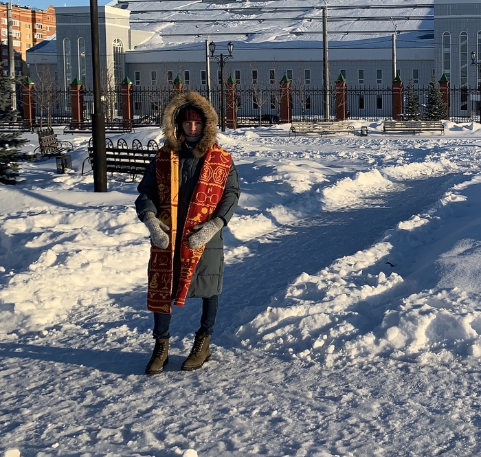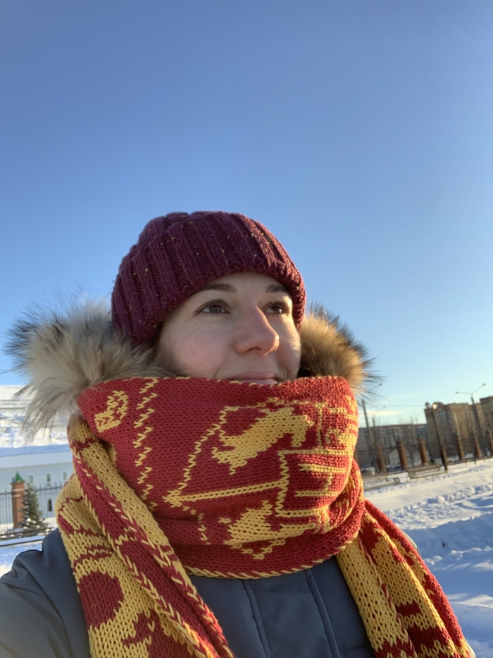 Я очень хотела сфотографироваться в нем на улице у елки, чтоб было видно в деле, в полный рост. Но оказался тот еще квест😂 На улице мороз и ветрище, шарф сдувает в стороны и он не смотрит в камеру, да и фотографа нет, телефон сам меня фоткает. В общем замерзла только. Но фотку все равно покажу