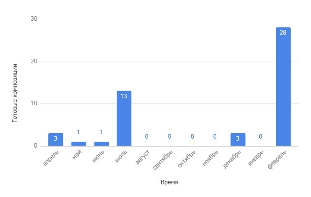 1. Готовых композиций (написанных, записанных и выпущенных) - в феврале их 28. Это больше, чем за весь прошедший год. Вот график для наглядности.