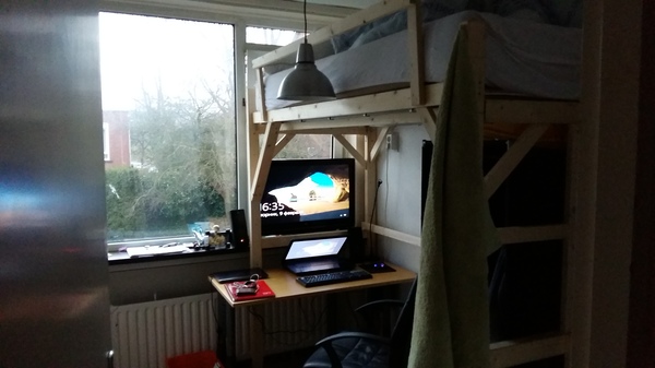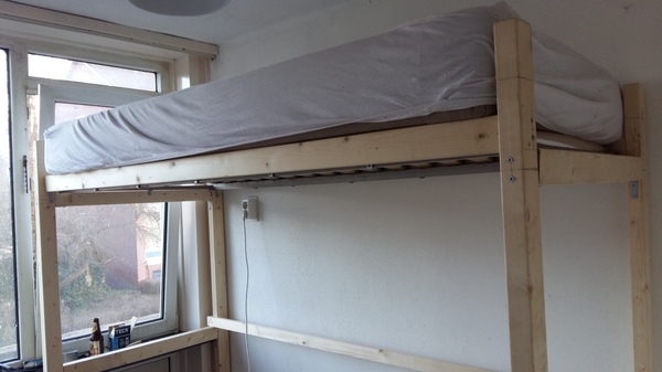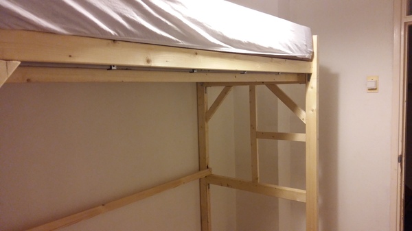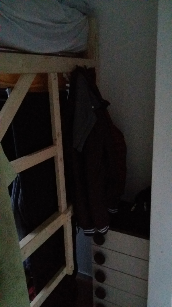 Вовремя переезда в новую комнату на длительный срок возникло желание ее удобно и красиво обставить. Была только одна проблема- комната примерно 280см*210см и потолок 245см. От предыдущего владельца остались матрас с постелью и подобие мебели: стол из обломков нечто, что скорее всего было шкафом, и тумбочка из ДСП. Мебель была сразу пущена на дрова. Сразу же были затарены новые стол, тумбочка, стул и рама под матрас. Так как, места в комнате ну очень мало и руки давно чесались сделать что-то эдакое, решил, что нужна двухъярусная кровать, так можно было сохранить все скромные 6 км.м. под используемое пространство.