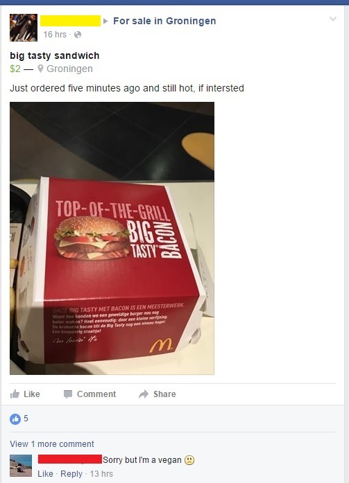 В городской группе-барахолке парень, шутки ради, выставил на продажу Биг-Тэйсти, "купленный 5 минут назад и еще теплый". Комментарий, в переводе не нуждается...