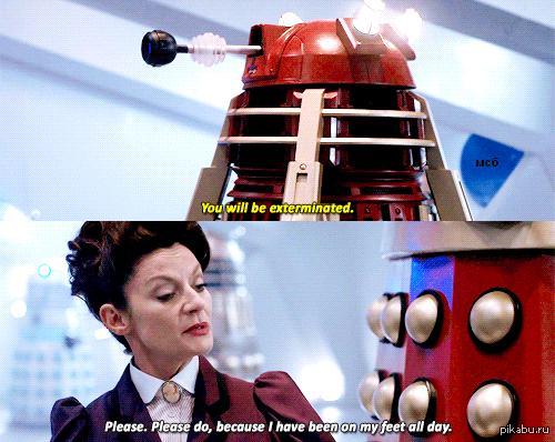 38 youtennant 9 лет назад Уничтожить — Вы будете уничтожены. — Прошу. Пожалуйста, уничтожь, а то я уже целый день на ногах. Комнатка ТАРДИС Доктор Кто