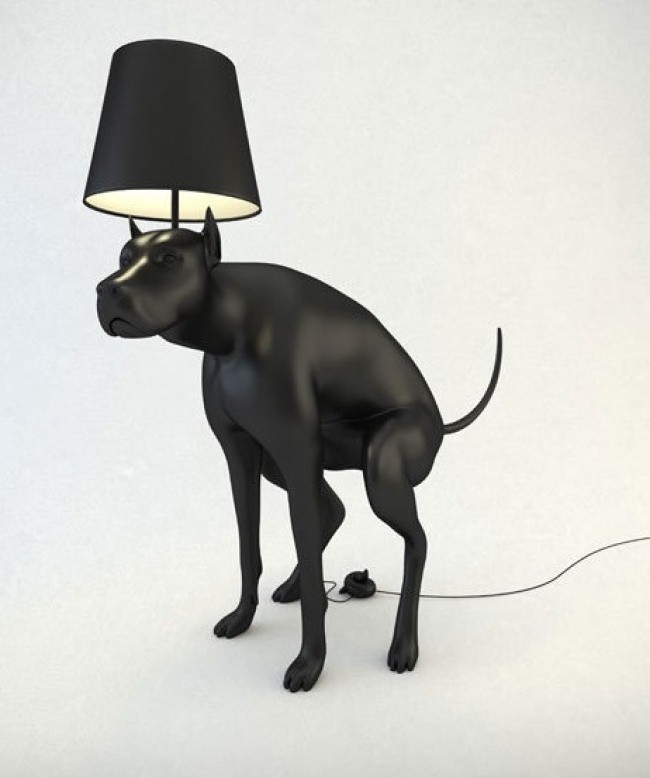 Дизайнеры — люди творческие, поэтому у них полно различных, своеобразных и интересных идей. Этот необычный светильник сделан в форме собаки, которая справляет большую нужду. Причем кусочек дерьма под ней — это включатель/выключатель светильника! Вот это полет мысли! Жаль, что дизайнер не додумался раскрасить собачек в гламурные цвета розовых оттенков, успех такому креативному светильнику был бы обеспечен. Светильники бывают разных размеров, от маленькой комнатной декоративной собачки, до огромного дога.
