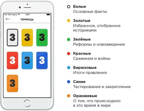 Первая тема в приложении — «Правители России». В ней собраны факты и знания о 36 лидерах нашей страны, от Рюрика до Путина. Сразу оговорюсь — приложение вне политики. Карточки не оценивают правителя, а только лишь сообщают конкретный факт.