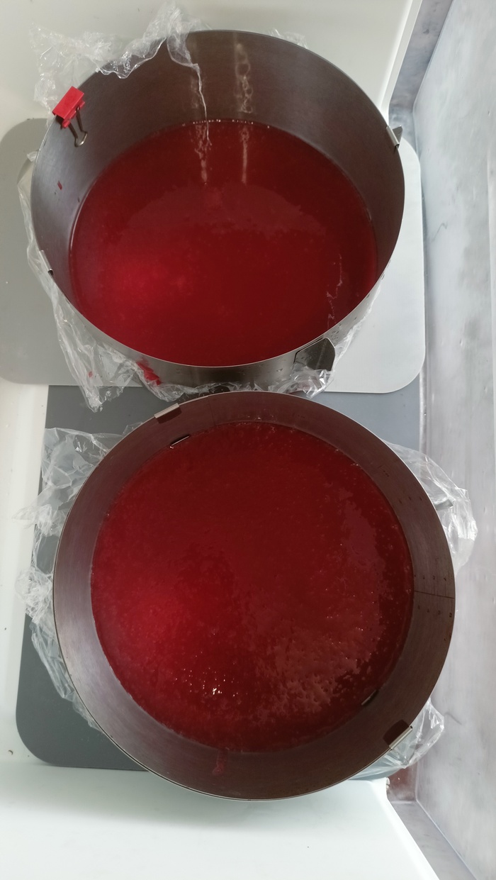 Про кольцо - я для этих целей использую то же самое разъёмное кольцо, в котором пеку. Просто аккуратно закрепляю, бока смачиваю водой, а потом затягиваю дно пищевой пленкой (на влажной форме пленка держится лучше). Кольцо ставлю на доску, чтобы можно было поставить его в морозилку прямо на доске