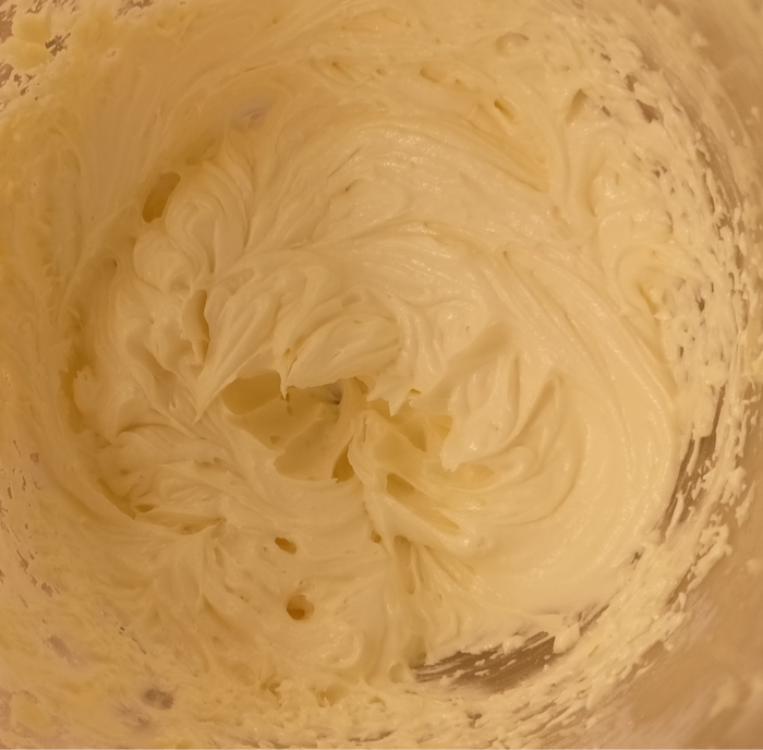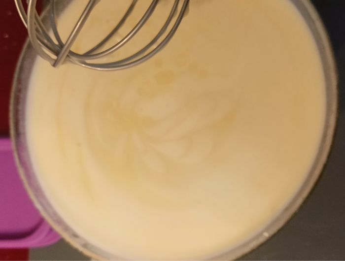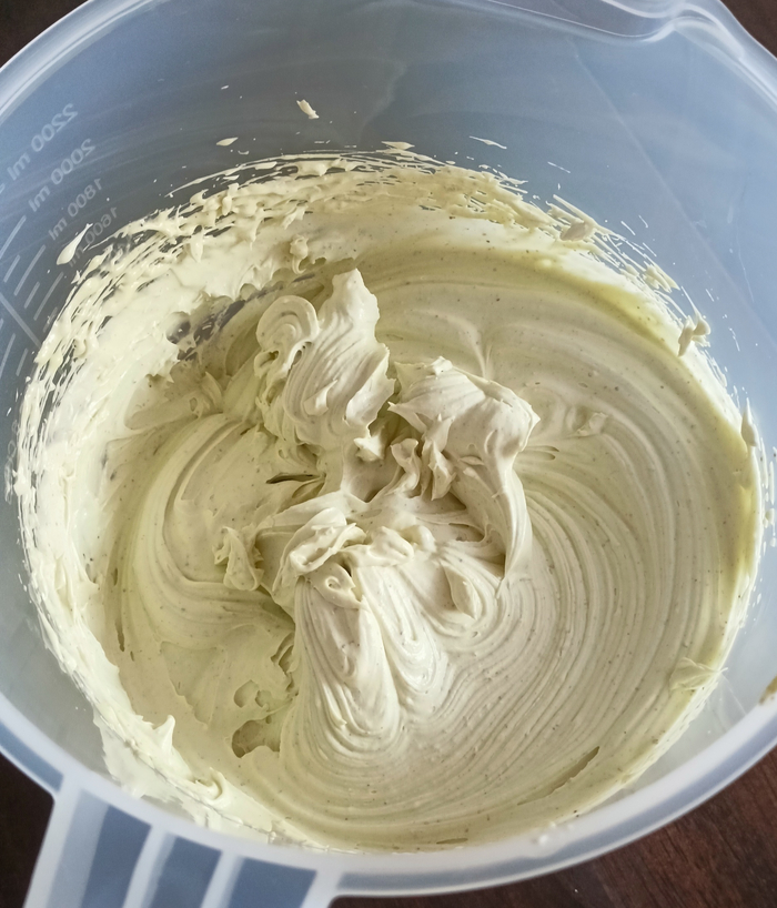 Дальше, не выключая блендер, начинаю вливать в общую массу холодные сливки, пробиваю до однородности. В самом конце капаю краситель, пробиваю до равномерного распределения красителя.