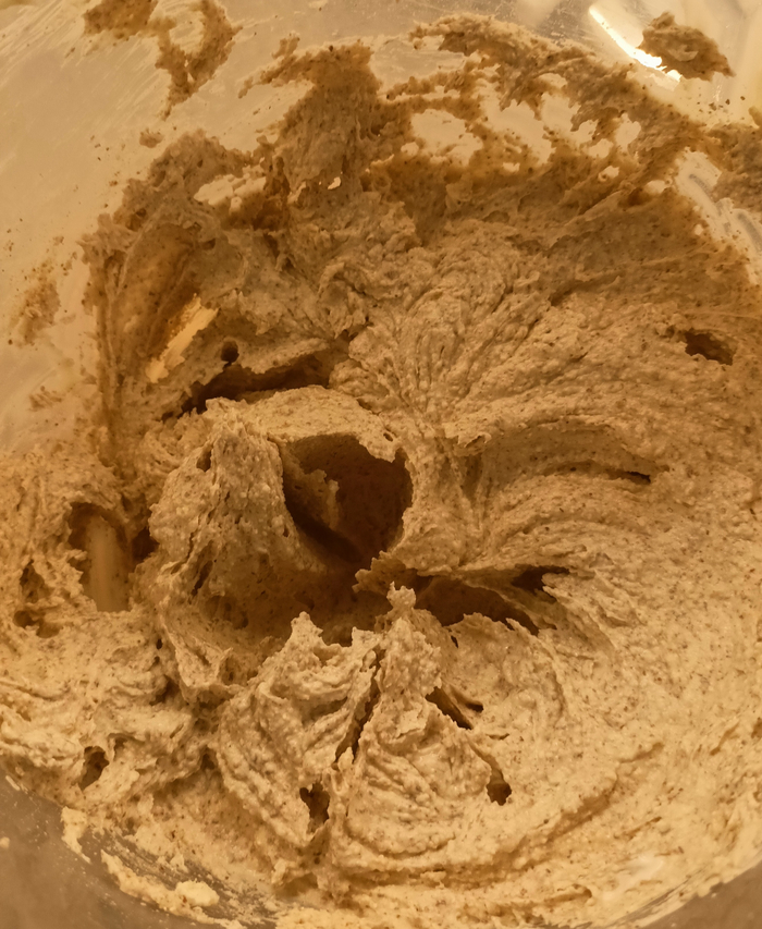 Теперь ставлю скорость миксера на минимум и начинаю поочередно добавлять ко взбитому яйцу кефирно-кофейную смесь и сухие ингредиенты. То есть добавила пару ложек сухих ингредиентов, плеснула немного жидкой смеси, потом сухие ингредиенты, потом жидкие, и все это время продолжаю мешать миксером. И так пока не введу все ингредиенты