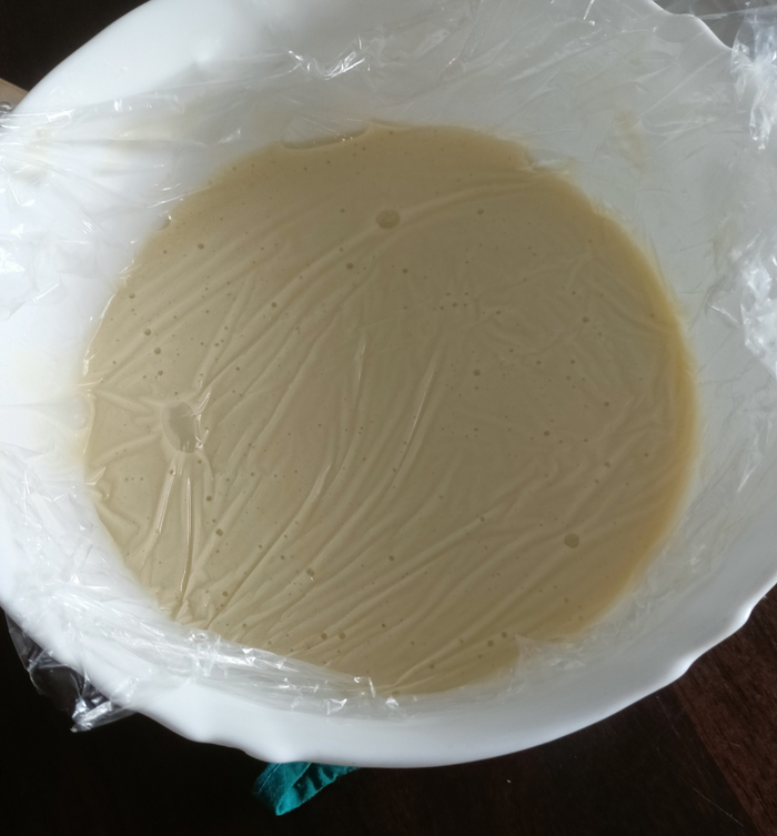 Готовый крем накрываю пленкой в контакт и оставляю остывать до комнатной температуры. Когда крем остыл, можно приступать к сборке.