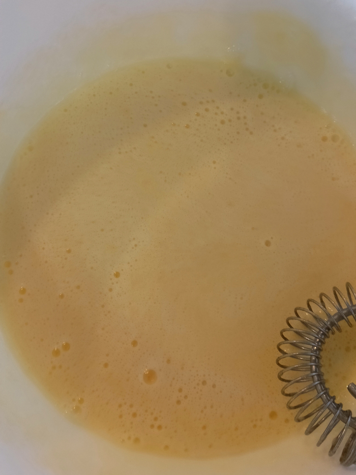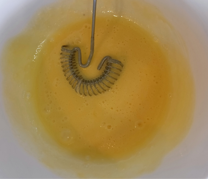 Затем к яйцам добавляю молоко и масло, размешиваю венчиком