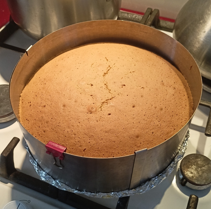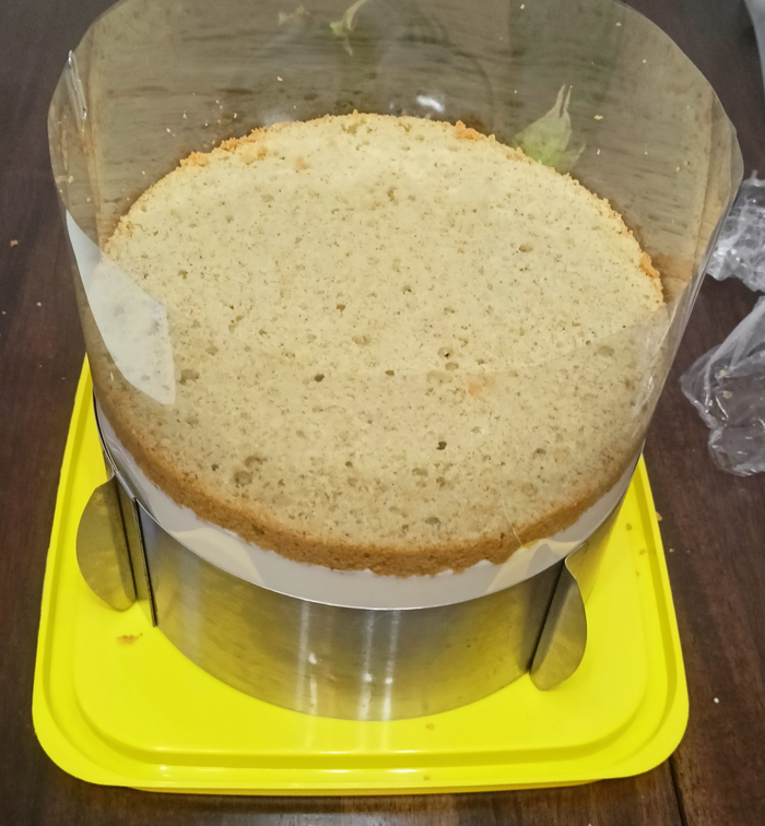 Нюанс. Я испекла бисквит в кольце 16 сантиметров. И собирать планировала в кольце 16см (я сейчас дома у родителей, и у мамы нет кольца меньше). Я не учла, что бисквит даёт усадку, так что бисквит, испечённый в форме 16см, при сборке нужно помещать в чуть меньшее кольцо. Поскольку у меня вариантов особо не было, я затянула низ кольца плёнкой (чтобы крем не убежал). Но вообще, конечно, лучше учитывать этот момент и печь бисквит чуть большего диаметра, чем минимально возможный диаметр вашего кольца для сборки.