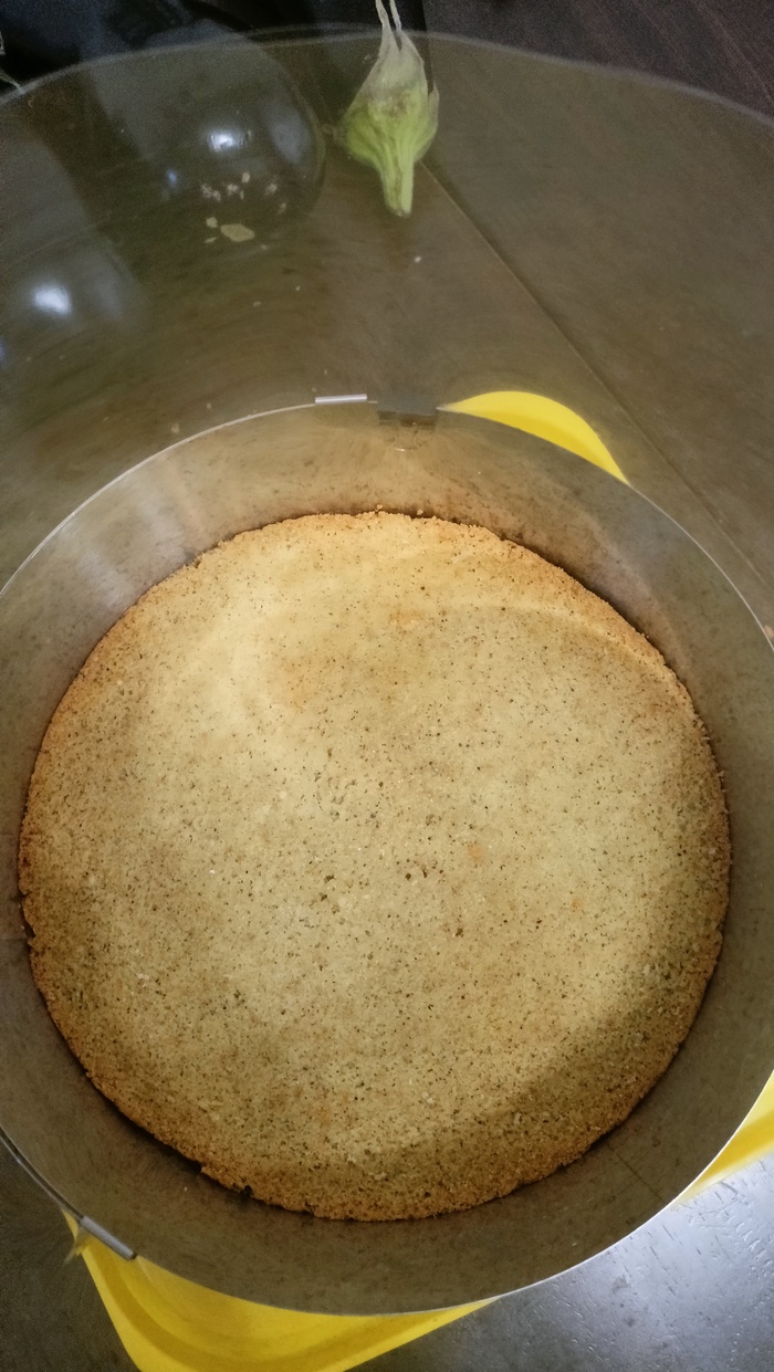 Нижний корж затягиваю кольцом. По-хорошему надо бы положить в кольцо ацетатную пленку, но у меня ее нет. Надеюсь, что с помощью ножа и такой-то матери как-нибудь достану потом торт))