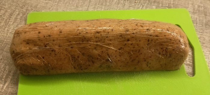 Даю остыть до комнатной температуры в форме, затем достаю из формы, заворачиваю в пленку и убираю на ночь в холодильник.