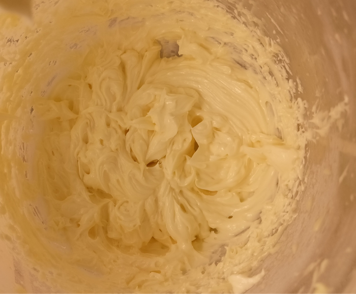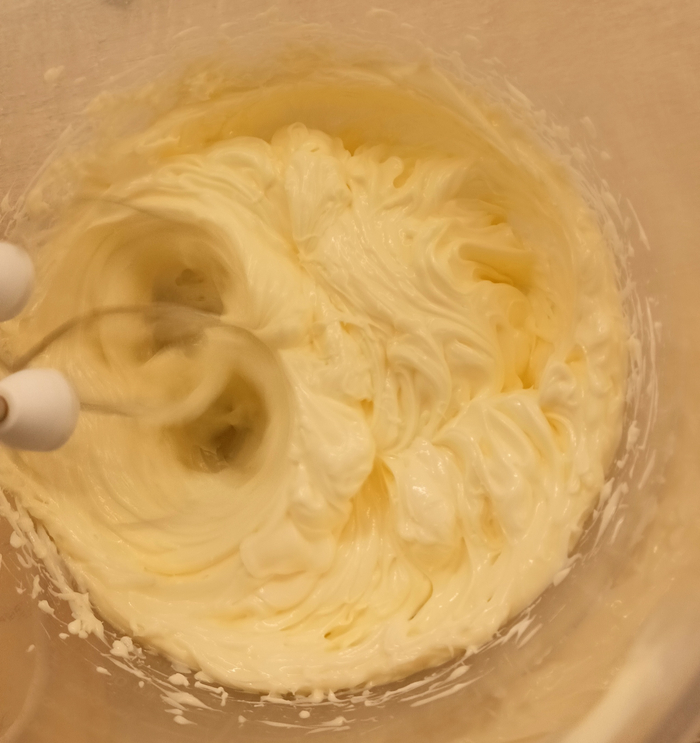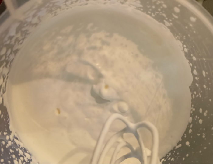 Теперь нам нужно взбить сливки до мягких пиков - до состояния, когда сливки похожи на растаявшее мороженое. Начинаю взбивать на самой маленькой скорости, постепенно увеличиваю