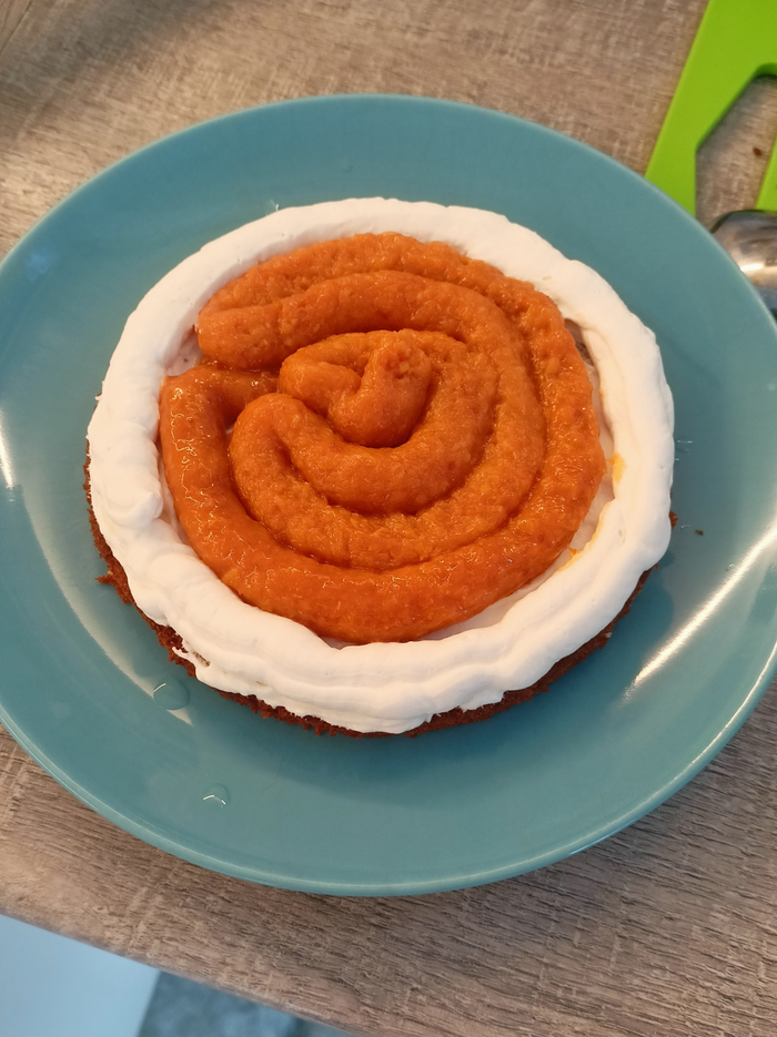 Это фото первой версии мусса с большим содержанием желатина. Тут видно, что масса уже застывает, хотя даже в холодильнике не была. В норме масса будет более текучей и спокойно разравняется лопаткой.