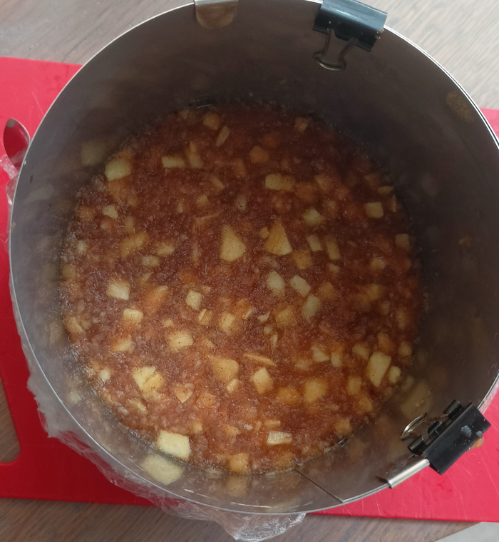 В однородную массу добавляем яблоки кубиком (те 100г), перемешиваем, доводим до кипения. Снимаем с огня, добавляем желатин, хорошенько перемешиваем, выкладываем в кольцо 18см, убираем в холодильник на час.